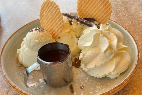 We springen met een meer dan gewone verwachting op de fiets naar Veldwezelt, want Filip Jeurissen van ijssalon Darius is chocolatier en gebruikt chocolade van het Belgische topmerk Callebaut. Benieuwd wat hij daarmee zou kunnen in zijn chocoladesaus. De kwaliteit is zoals we verwachtten: prima. De slagroom heeft een aangename, zachte bitterheid en het smeuïge ijs is goed van temperatuur. De saus wordt apart geserveerd en door het gebruik van een groot bord konden slagroom en ijs toch naast (en niet op elkaar) geserveerd worden.